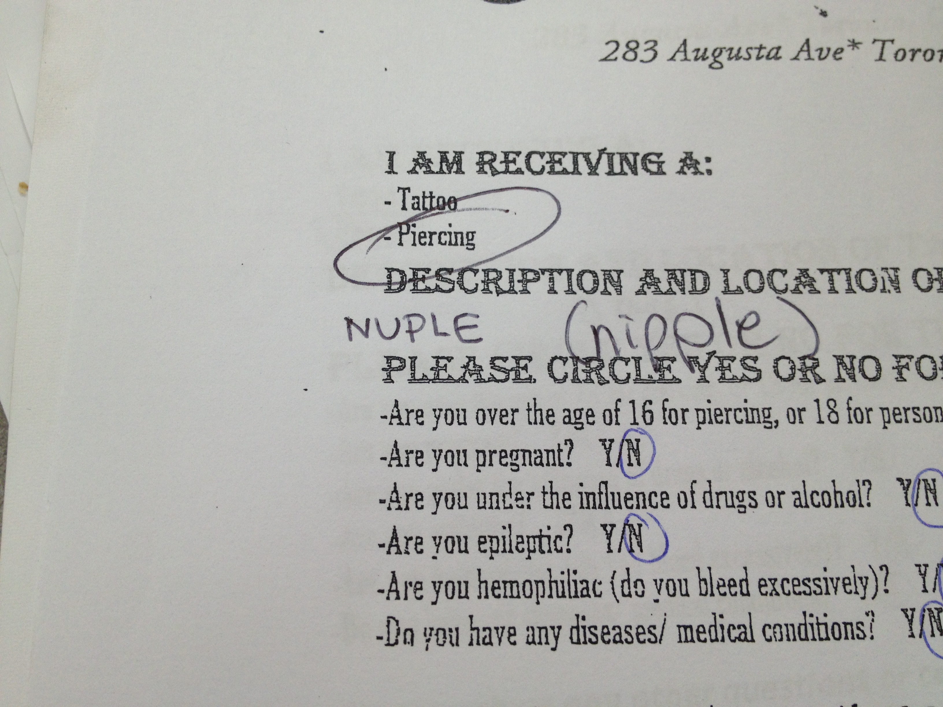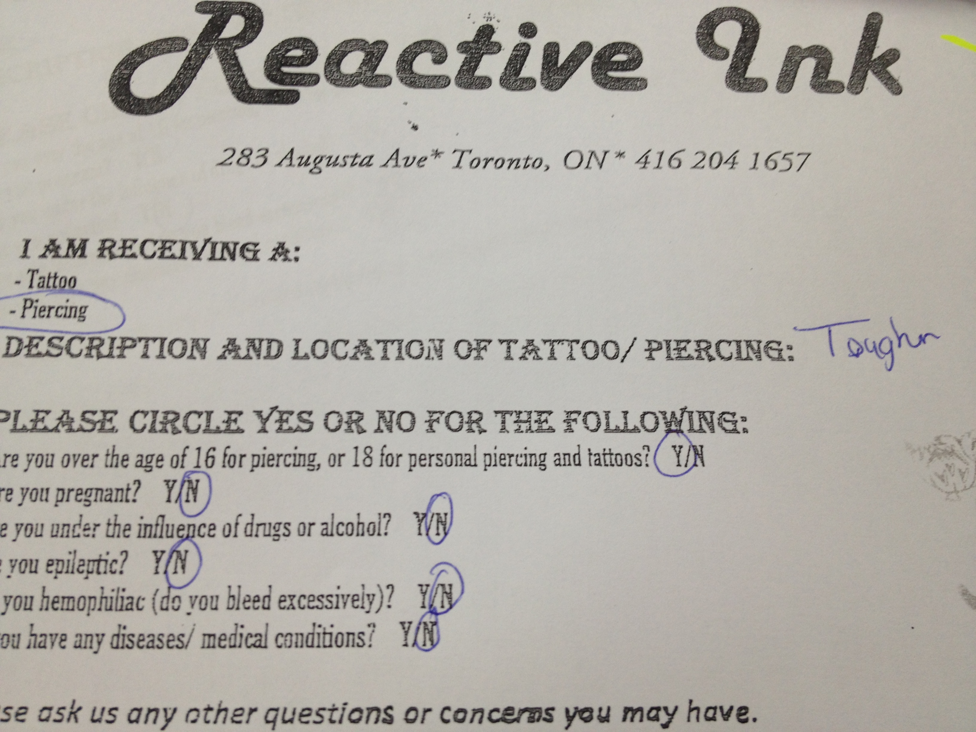 Since I started getting tattoos 11 years ago, I’ve thought it would be cool to work at a shop. Fast-forward to last summer, when a friend who pierces asked if I could help out on Saturdays. A note about Saturdays at my shop: they are in-fucking-sane. We have a crazy piercing special, and 16-year-olds come from far and wide (read: the 905), the wait can be up to three hours, and we do between 150-200 piercings each and every Saturday.