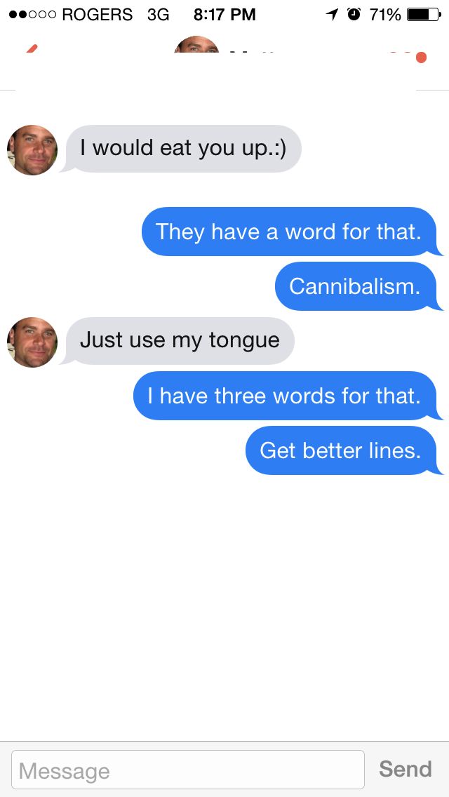 Bro. No. You are not being complimentary. You are not being clever. I don’t know what this is. This. I just do not get this. Who told guys that this is how you interact with women? In fact, who told anyone that this is how you interact with another human being? This ranks up there with the dude who opened with saying I looked like I ‘needed a mouthful.’ I know I’ve mentioned him before, but it bears repeating because what the actual fuck? I have to assume these guys interact with women at some point throughout their day and manage not to be complete neanderthals (I can’t imagine telling the TTC driver you like her rack will end well for you), yet put them in any sort of dating/whatever scenario, and they forget how to word. It’s like they don’t realize the people on the receiving end of these messages are, you know, people. Would you kiss your mother with that mouth?