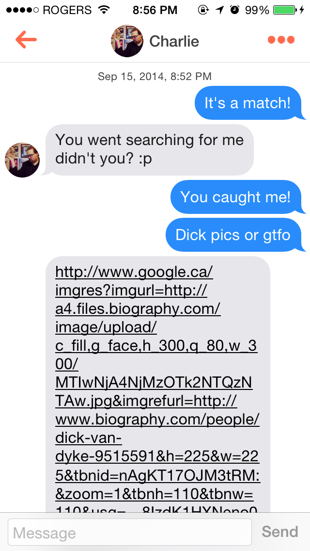 Other fun things in the world of online dating: the unmatch/block. Say one wrong thing, and BAM! You’re out of there. I’ve used this handy feature myself, usually any time someone mentions their genitalia/my boobs/their horrific political affiliations. However, it has been used on me a time or two.