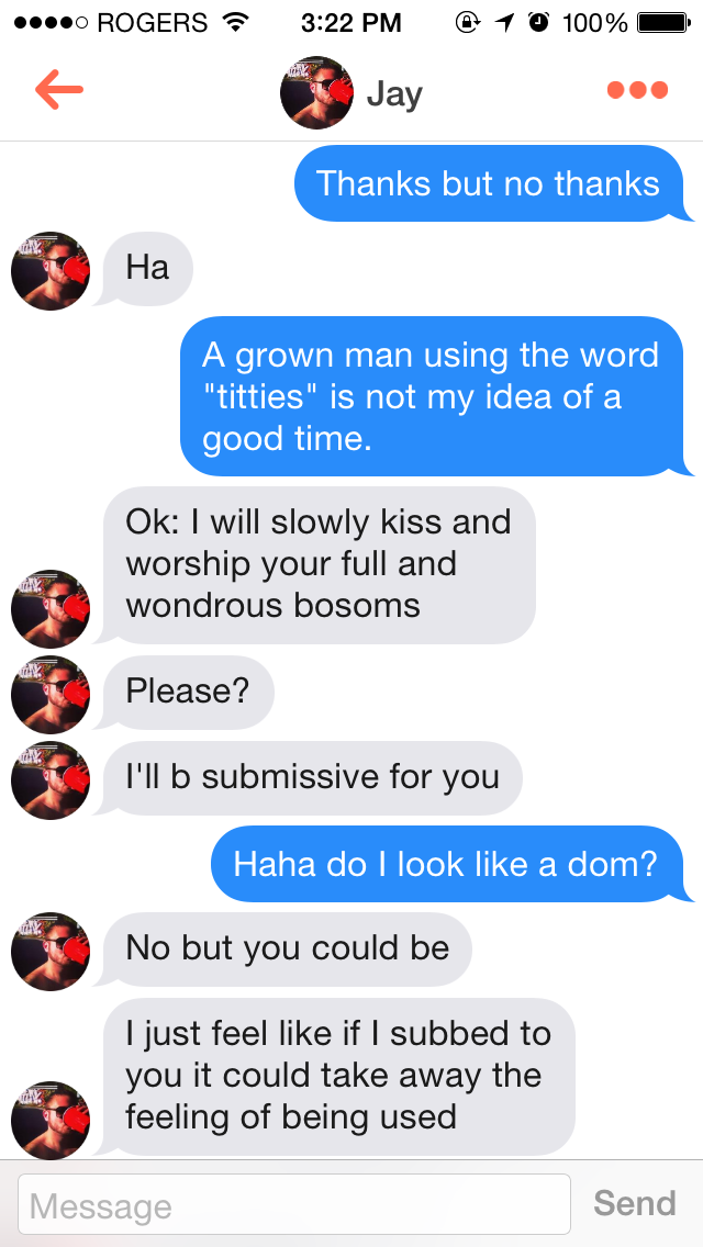 […] gross exchanges from men who’ve seemingly never interacted with other humans. I’ve posted a few before, but since I’ve been sending some of the recent gems his way, I have built up […]