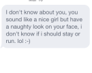 This gentleman’s first message to me (might I add his profile states he is romantic, caring, sweet, and loving):