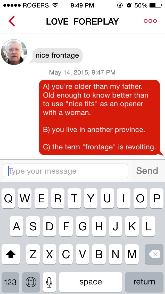 If I find myself still doing this when I’m in my sixties (sweet roller skating Christ, I hope that doesn’t happen) I now know I have what it takes to snag myself a senior suitor. As a side effect of my experiment on multiple sites, I’ve discovered I’m quite popular with the aging population in the prairie provinces. I’ve also discovered that the inability to talk to a woman about something other than her tits is not solved by a mid-life crisis: